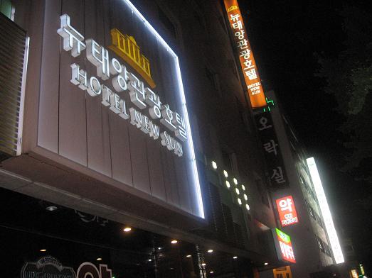 今回泊まった「ニュー太陽観光ホテル」です。場所は地下鉄・釜山鎮駅の前にあり、繁華街からも結構離れていて、不便だった。ホテルのランクも3ムクゲと中級でした。日本人は多かったが、活気がなかったです。