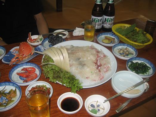 2日目の夕食はチャガルチ市場内にある海鮮料理の店で「ヒラメ・メバル」のフェ(刺身)をいただきました。まぁ 刺身は日本でだべるのと、あまり変わらないが、コチュジャン(辛子味噌)にサンチュや大葉などを包んで食べるみたいですが、素材本来の味が生きてこないので、結局は醤油と山葵を用意してもらい日本流で行きました。