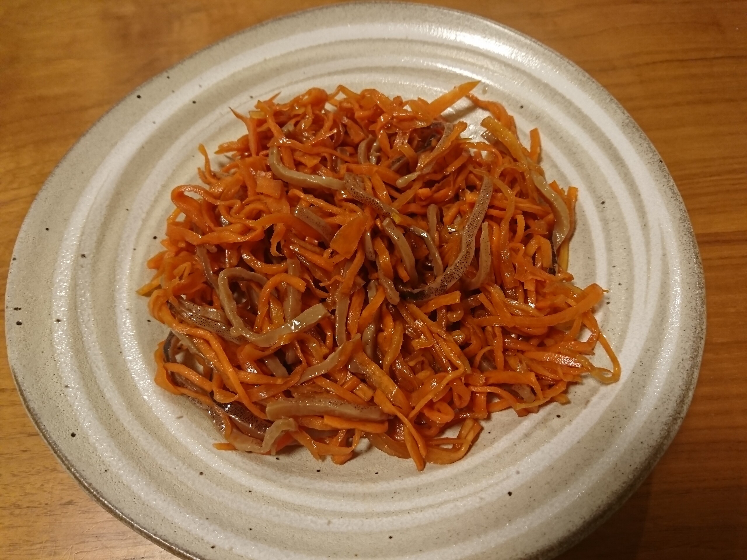 今日の酒の肴は福島県の郷土料理のいかにんじんです。人参のコリコリとした食感にイカの旨味が人参に移っててメチャ美味しい〜 酒の肴に最適ですし熱々ご飯にのせて食べても最高です。