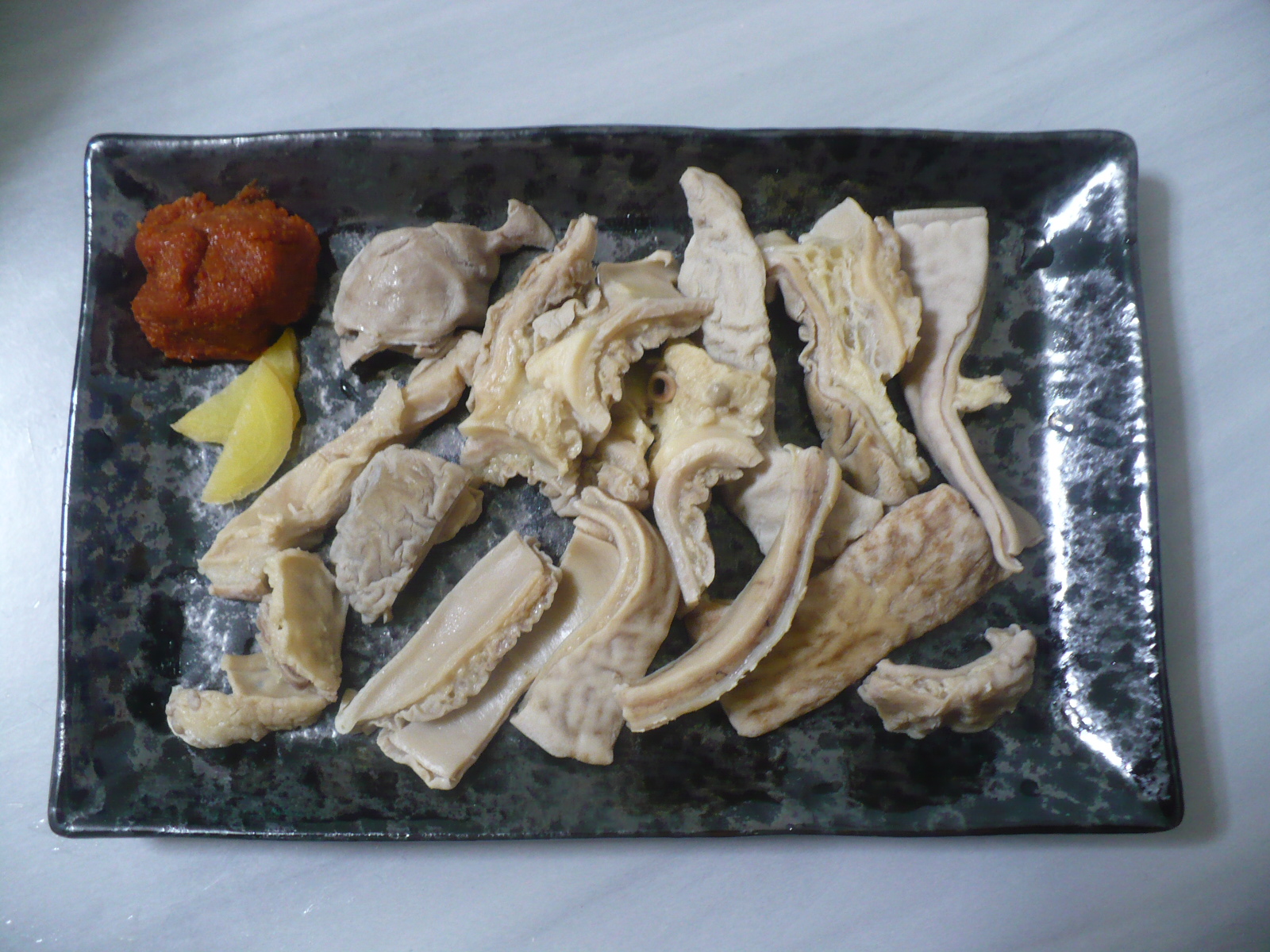 今日の酒の肴も先週、喜多方のマカベ精肉店で購入した馬モツ刺しです。