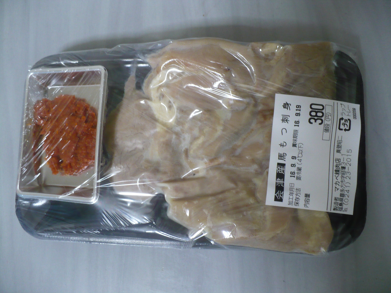 今回、予約注文で肉を取りに来るお客さんが多くて、店内の写真は取れませんでしたが、馬肉の種類が豊富でいろいろな部位が売られていました。今回は馬モツ刺し1パック650円を購入しました。会津の地酒を飲みながら食べてみたいと思います。