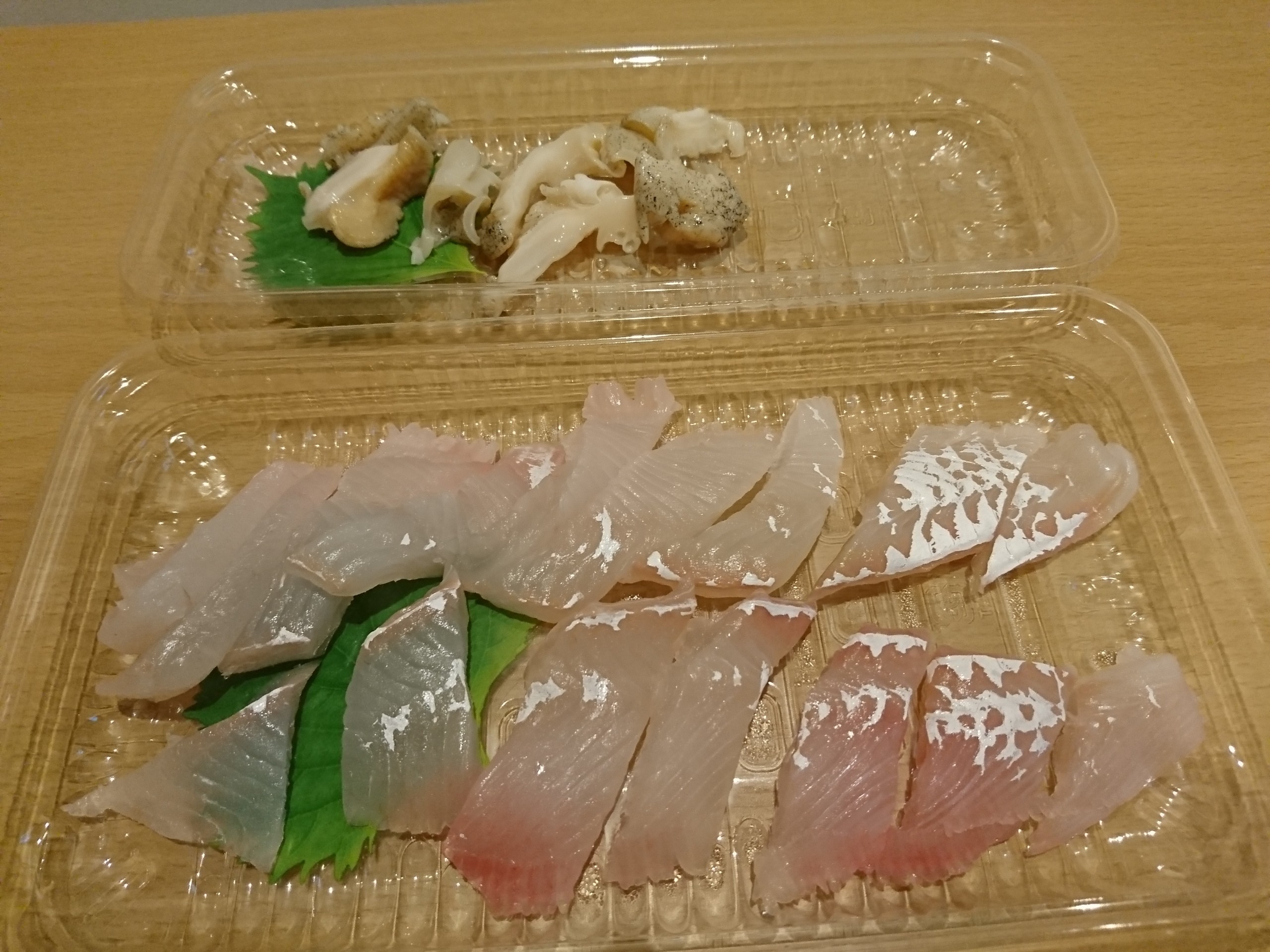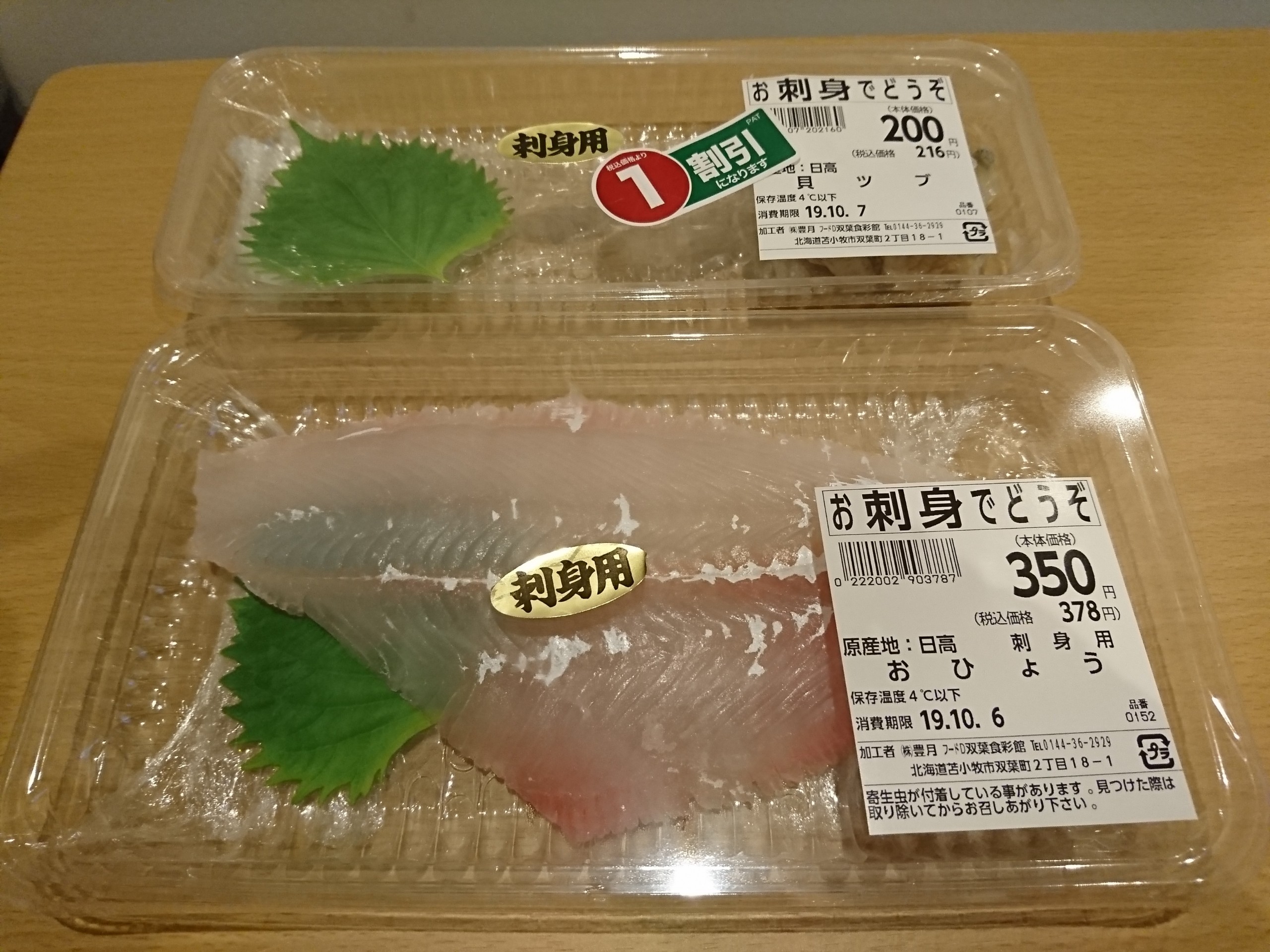 今日の酒の肴は日高産のつぶ貝とおひょうの刺身です。おひょうとは北海道などの冷たい海に住む、体長3〜4メートルにもなる超巨大カレイです。今回買ったおひょうは稚魚だと思います。^^