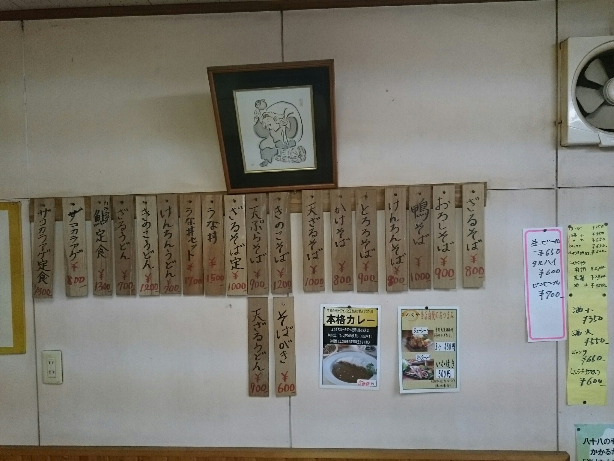 お店のメニューです。ラーメンやうどん・蕎麦・丼物に定食類とおつまみ系が少々ありますが、全体的にメニューは少なめです。