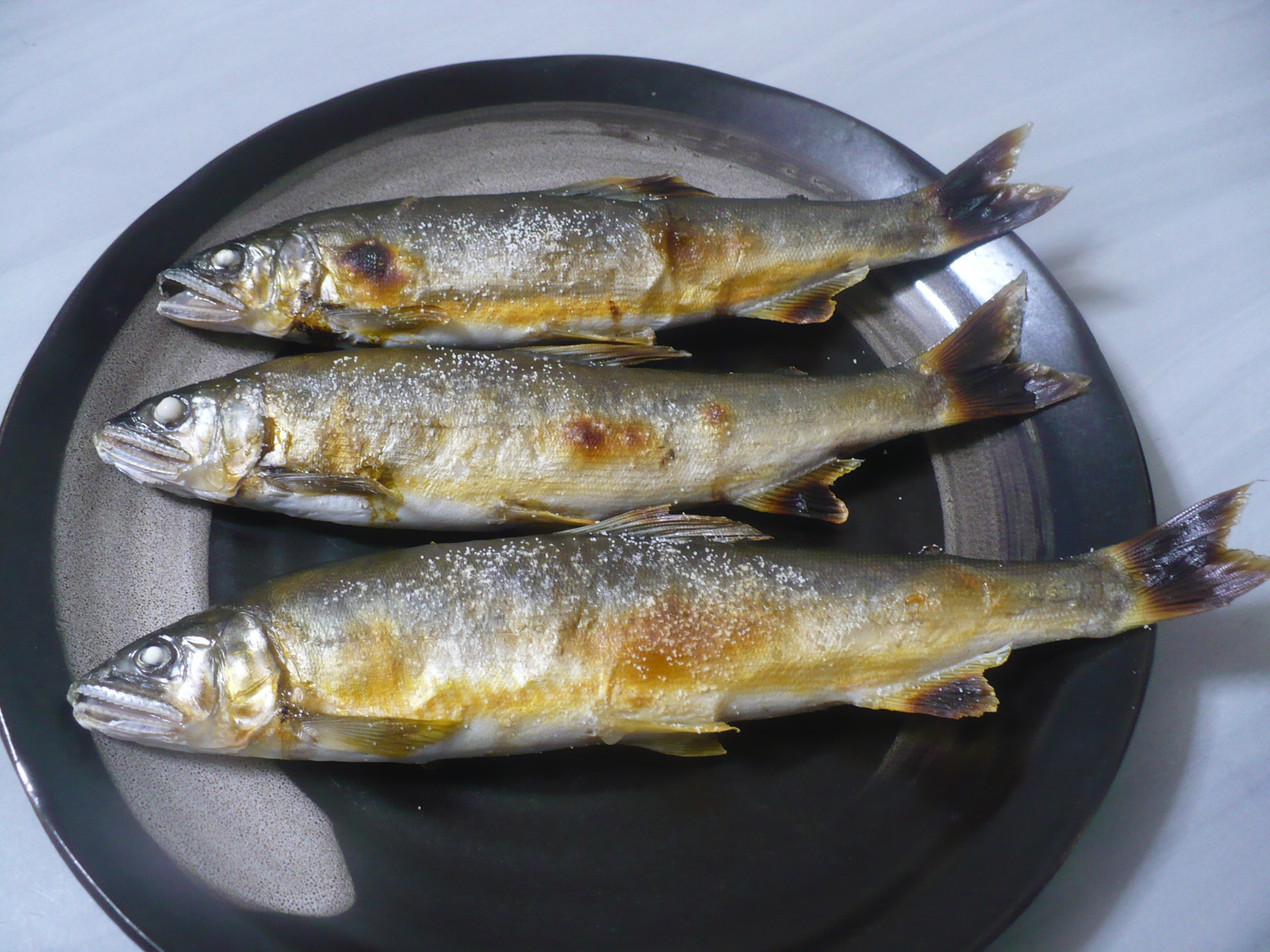 今日の酒の肴は鮎正宗の酒に合わせて、近所の箒川で友人が釣った鮎を塩焼きにして食べました。貰ってから4ヶ月ほど冷凍してましたが、鮮度は落ちてなくて美味しかったです。
