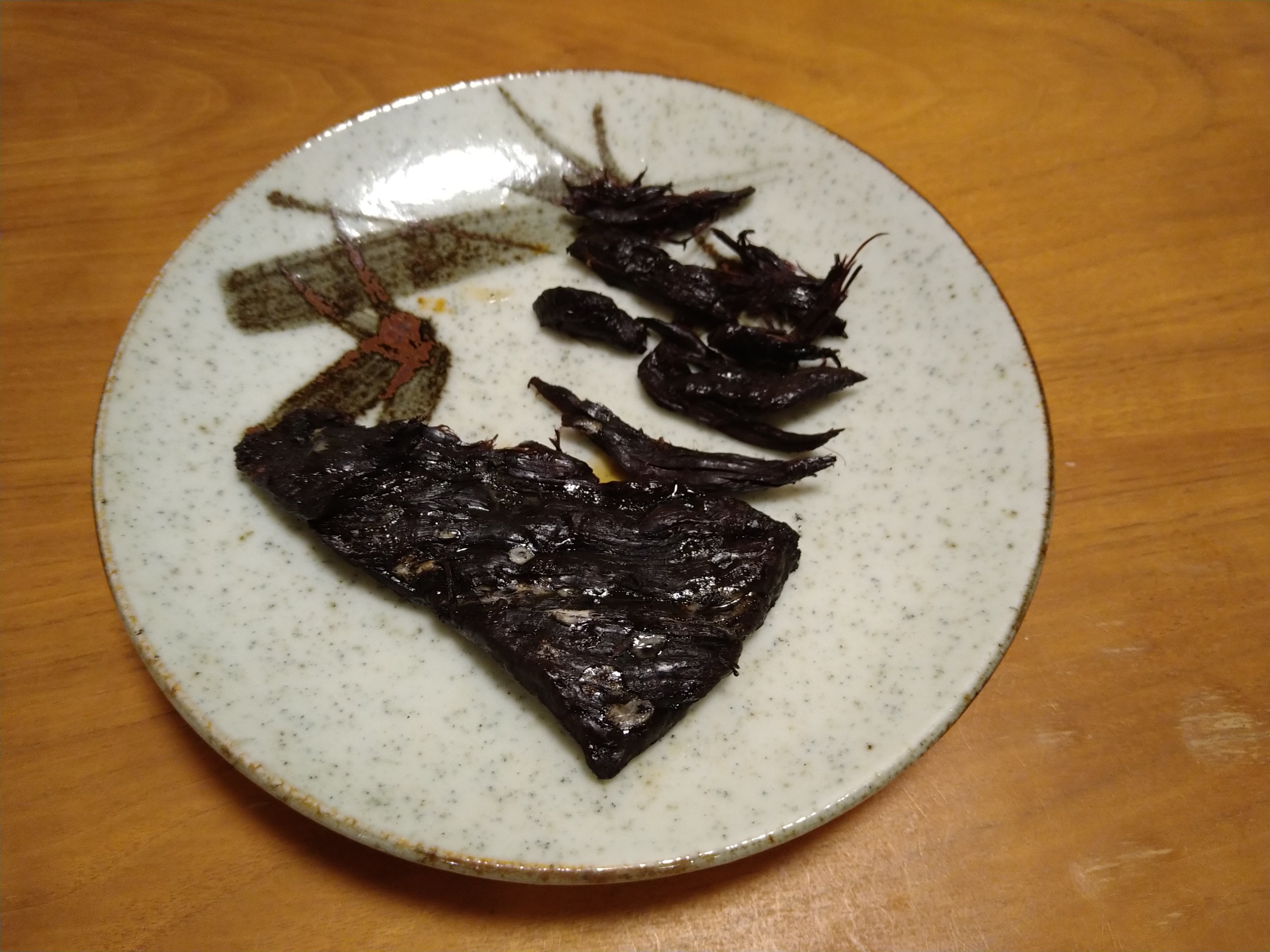 塩鯨は塩分濃度が非常に高いので30分ほど水に浸してからフライパンで焼きました。それでも焼いてると水分が蒸発して肉の表面が少し白くなり塩の結晶が出てきました。食べてみるとまだ結構塩辛いです。辛いので2枚ほど食べて飲んだ〆に肉を小さく刻んで緑茶をかけてお茶漬けにして食べたら良い塩加減で美味しかったです。今度、焼いて食べる時は十分に塩抜きしてから焼きたいと思います。