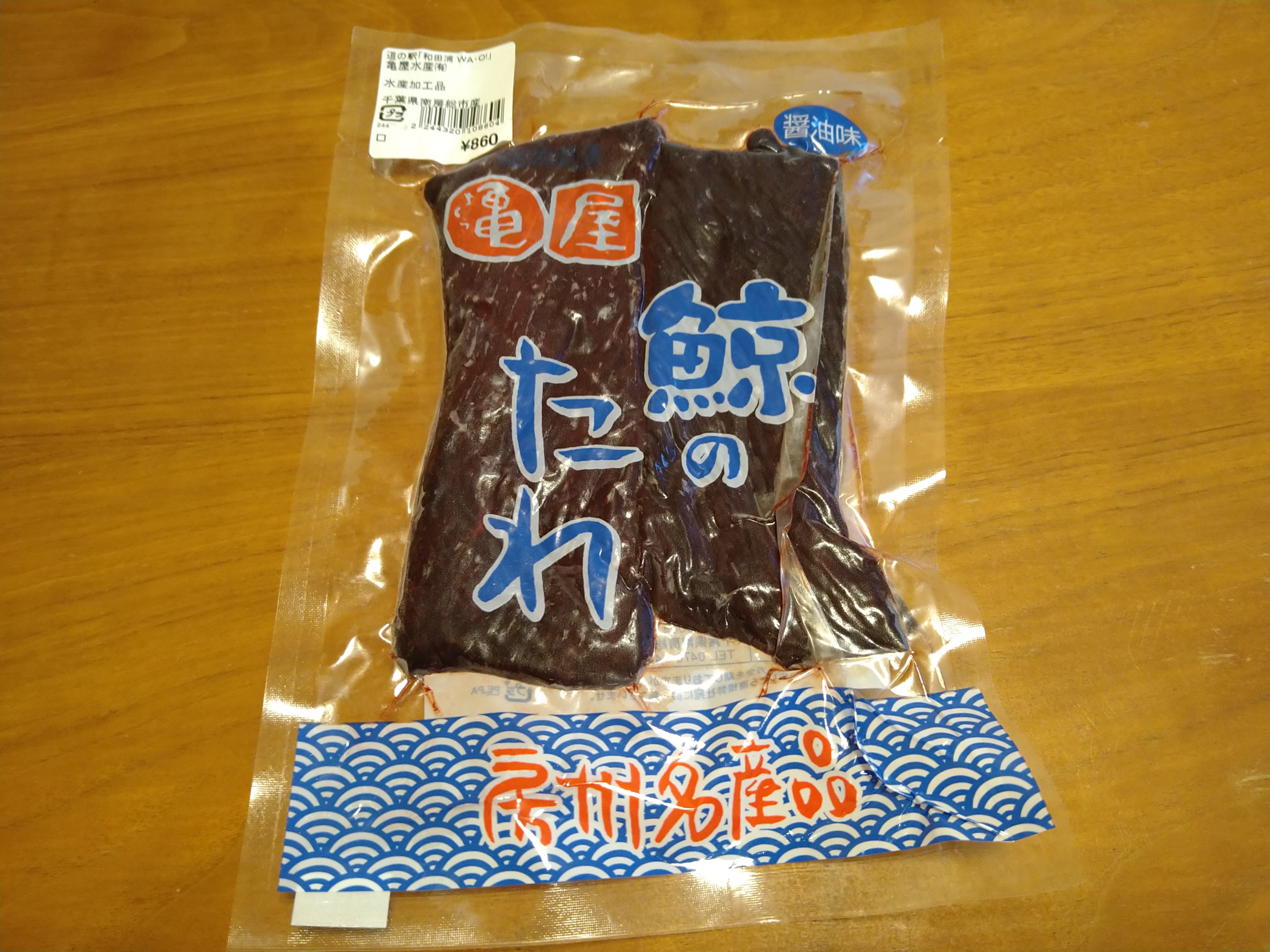 今日の酒の肴は千葉県南房総市の郷土料理でツチクジラの肉を塩や醤油ベースのたれに漬け込み天日干しした干物・鯨のたれです。今回食べた鯨のたれは南房総市の亀屋水産が製造していて、鯨肉は房総半島沖産のツチクジラを使用しています。