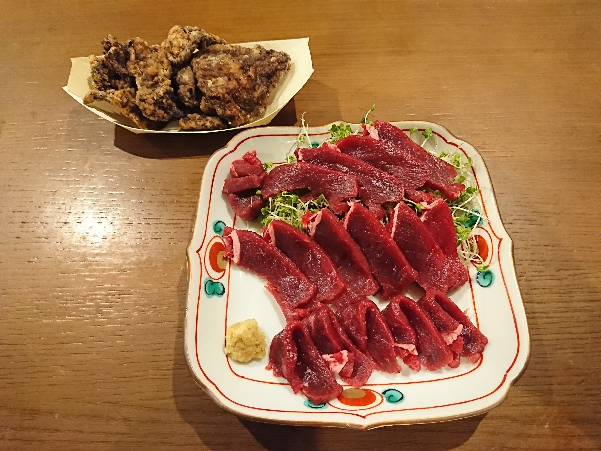 食べた感想は赤身肉はパサパサとしてましたが、シャキシャキの水菜と一緒に食べると美味しいです。また本皮は少し癖がありますが甘みがあってこちらも美味しかったです。