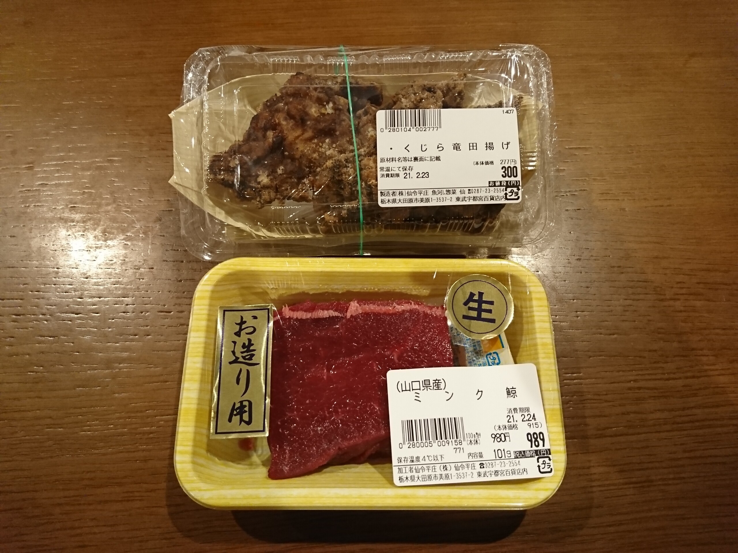 まずはタコの頭、少し茹でる時の塩分が強いのか?塩気が気になりましたが、真だこの頭が1つ200円とやすく量もあって美味しく食べ応えがありました。鯨は産地や名称が書かれていませんでしたが、11切れで値段が390円と安いのでナガスやミンクではなくニタリ鯨と思われますが、癖が無く比較的鮮度も良く美味しかったです。
