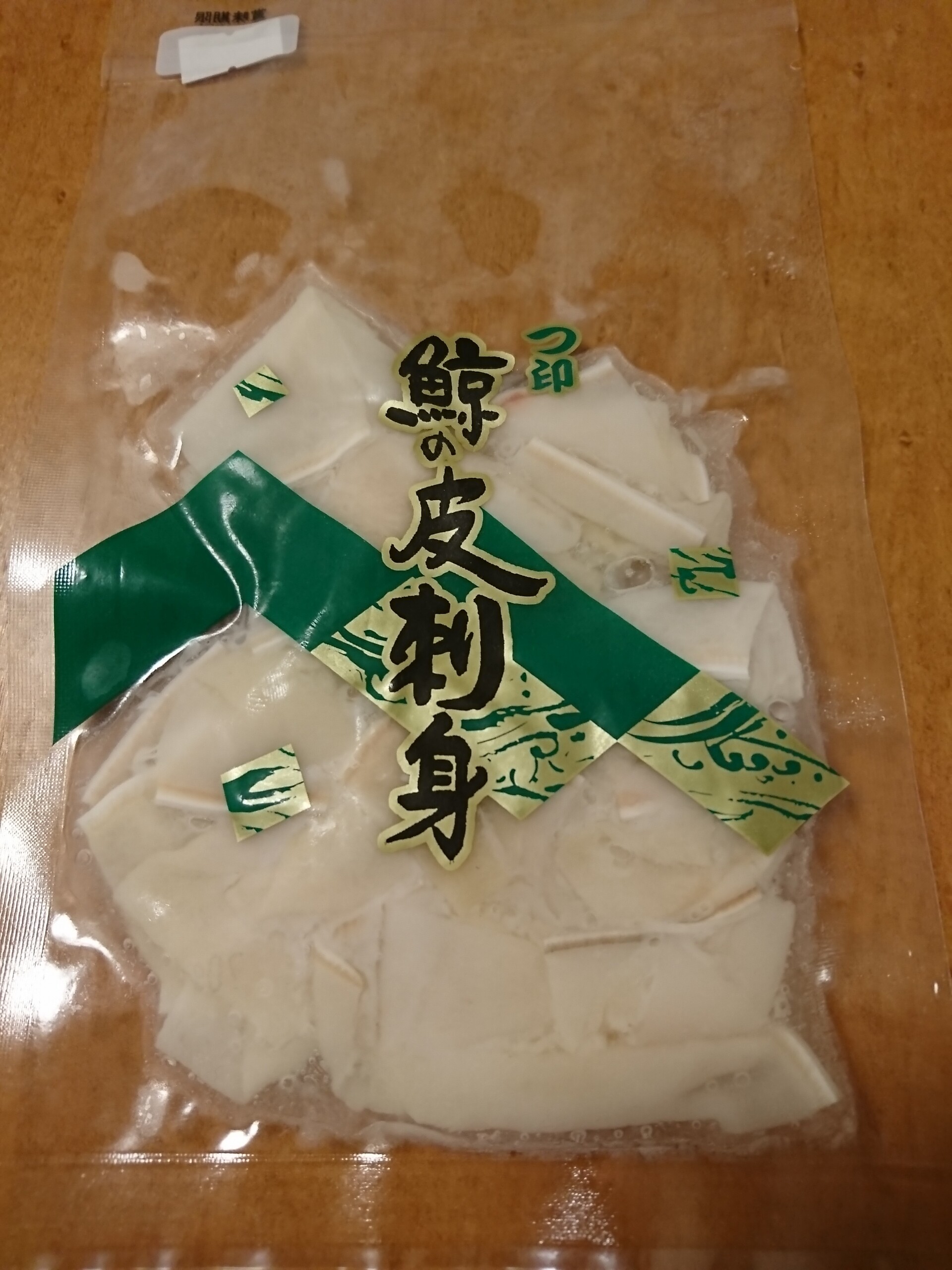 今日の酒の肴は宮城県石巻市の外房捕鯨が製造する、北西太平洋で調査捕鯨で捕獲されたミンク鯨の鯨の皮刺身です。