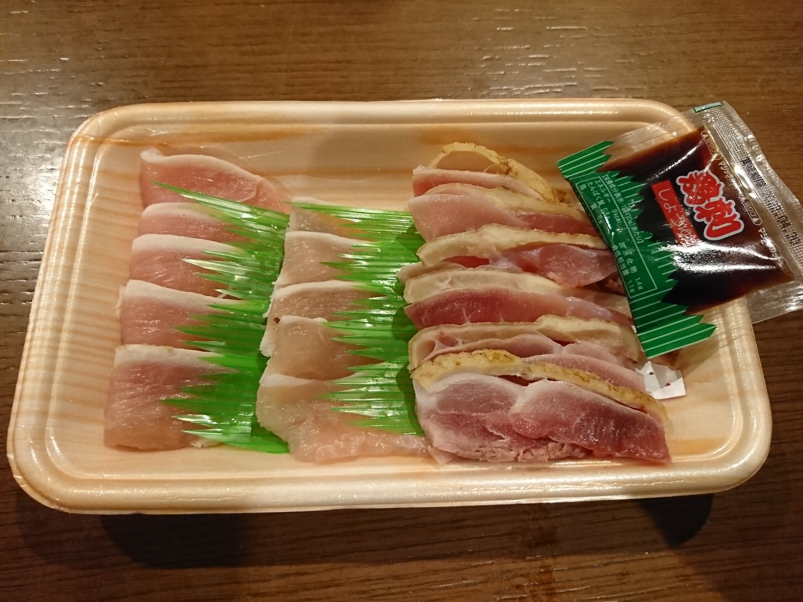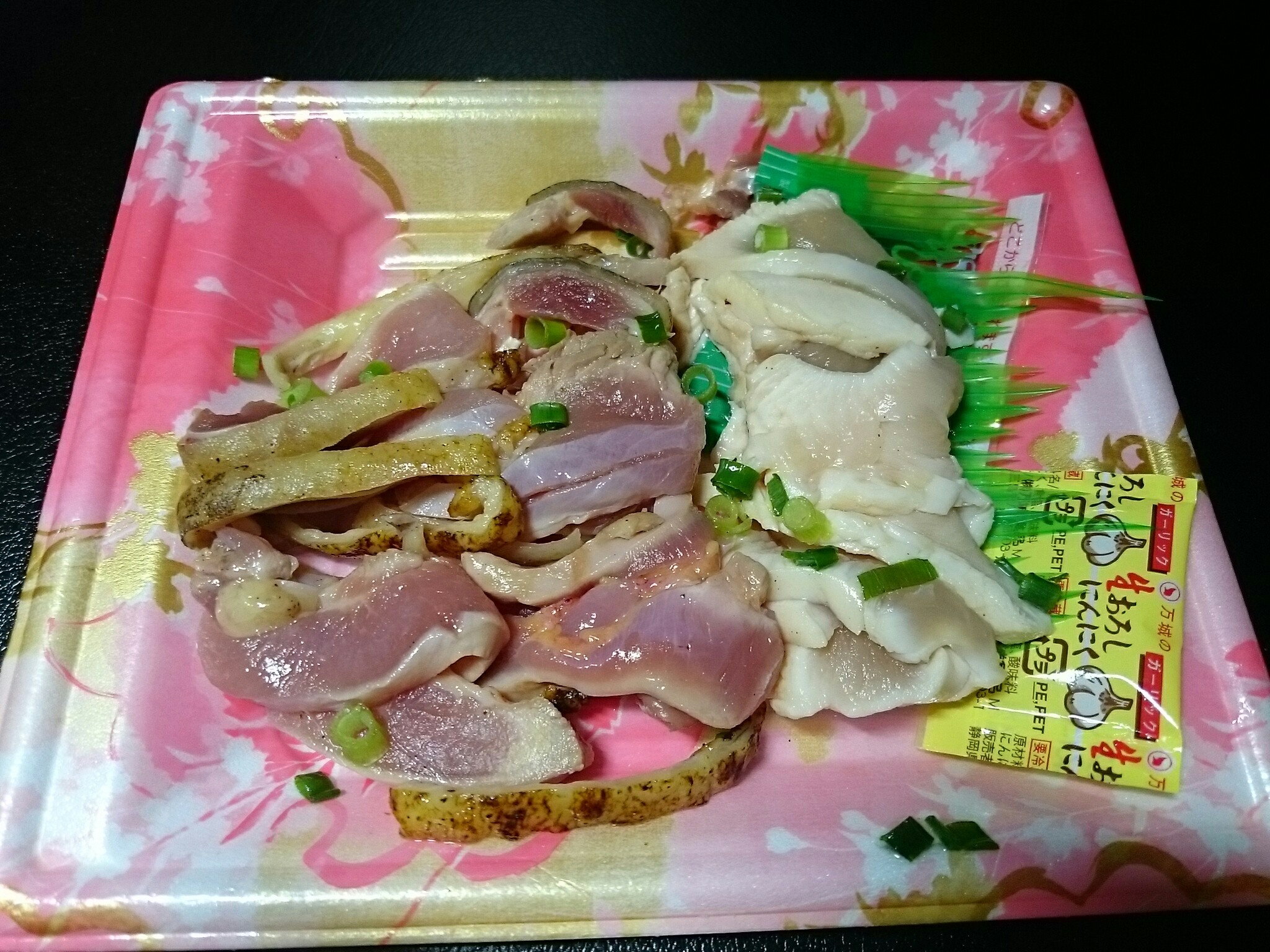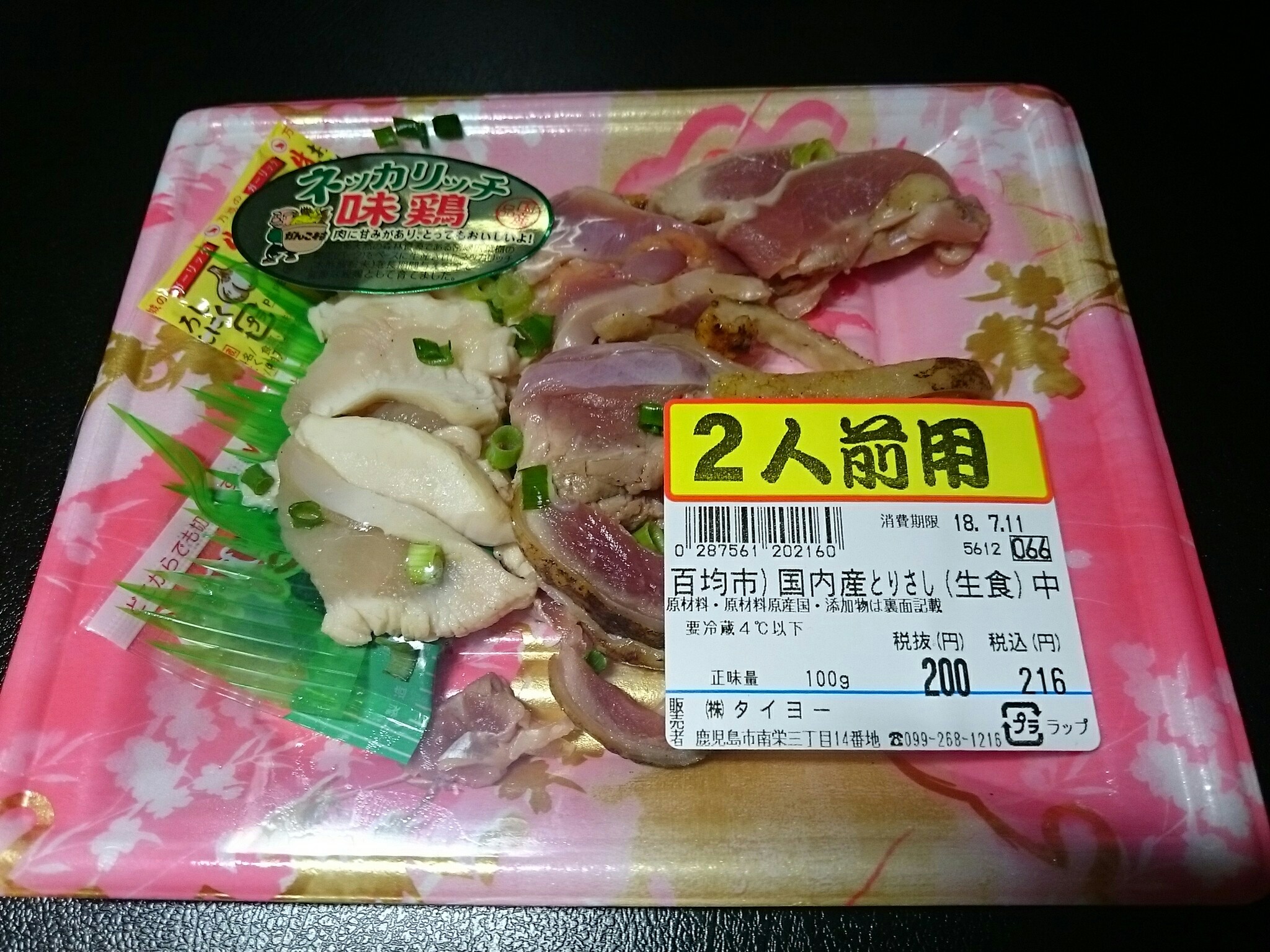 今日の酒の肴は尼崎市の鹿児島物産で500円で買った、鹿児島市の二幸食鳥が製造する鳥刺しです。