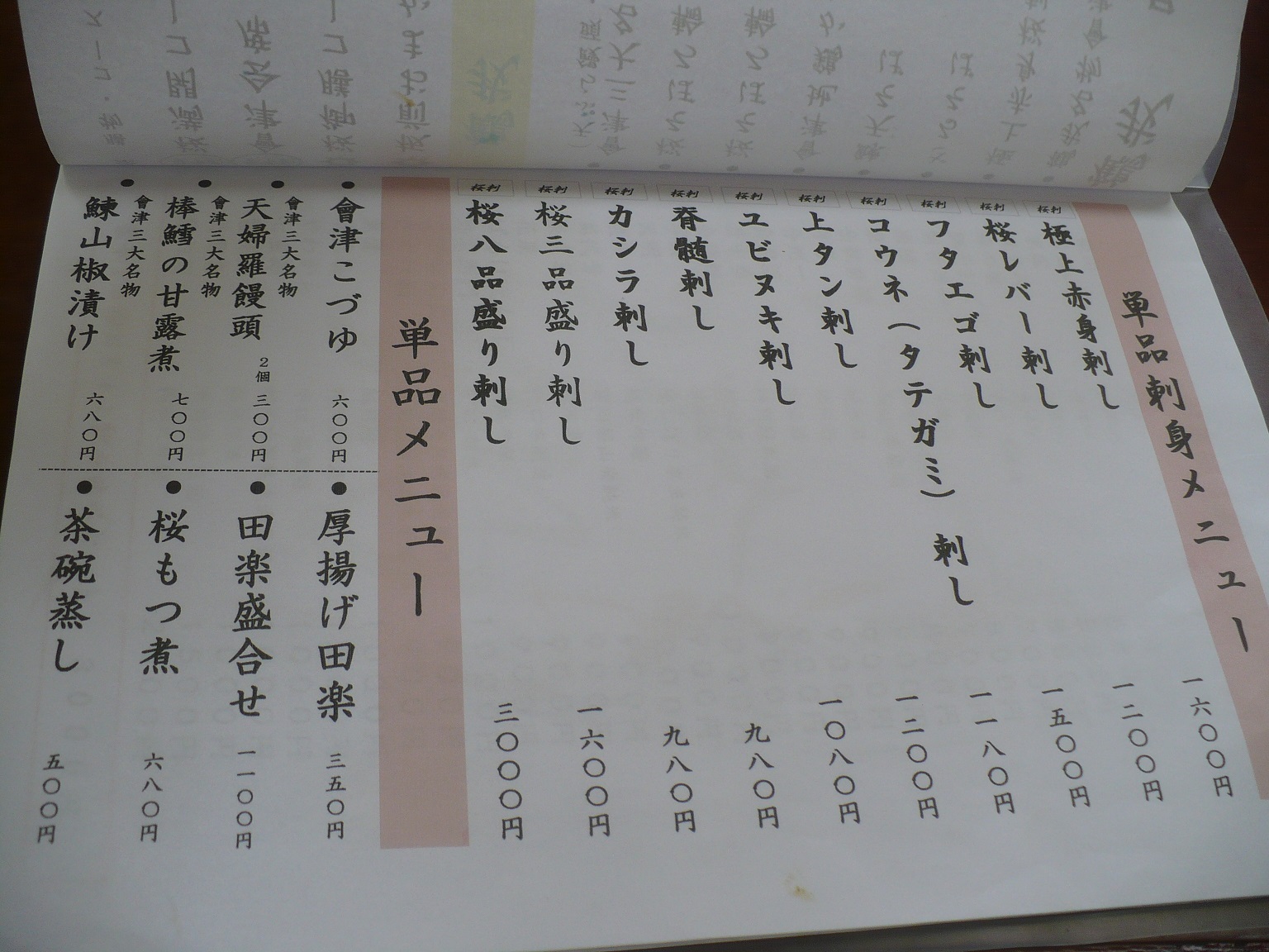 単品メニューです!馬刺しの種類が充実しています。一度、桜八品盛り刺しを食べてみたいですねぇ〜 馬刺しの他にも単品メニューで会津の郷土料理なども充実しています。