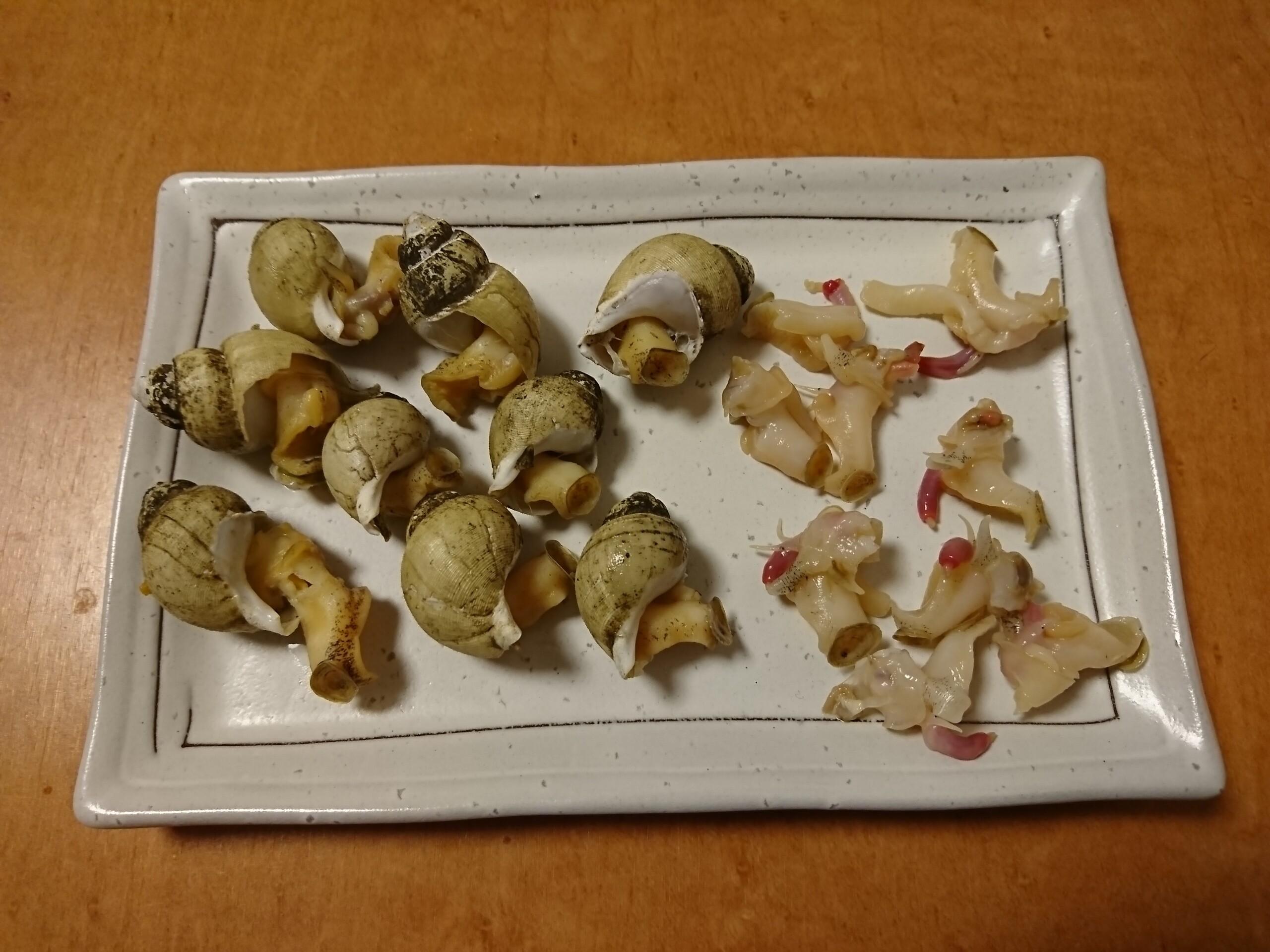約半分を殻と内臓を取り除いて刺身にもう半分をレンチンで蒸しました。刺身はコリコリとした食感に甘味と旨味があって美味しい〜 レンチンの方は生のコリコリ感は無くなってブヨブヨ食感に変わりますが、貝の旨味が生よりまして内臓の旨味も合わさりこちらも美味しかったです。新鮮なつぶ貝を安く食べれるのは嬉しいですねぇ〜