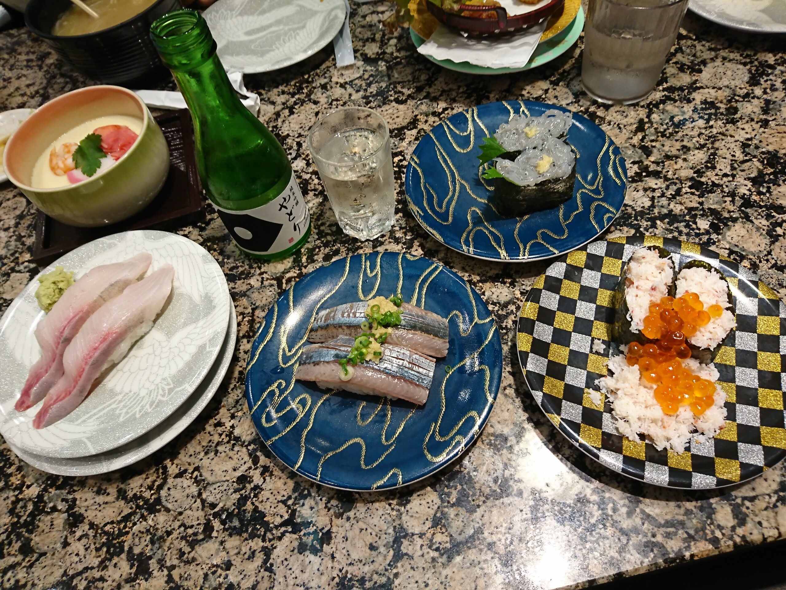 やっぱがってん寿司はやや高級な回転寿司やから美味しいねぇ〜 日本酒は秋田県由利本荘市の雪の茅舎でお馴染みの齋彌酒造店の純米吟醸・やどりです。一合壜で880円もするけど、フルーティーな吟醸香があって適度な酸味としっかりとした旨味のある酒でとても美味しく、寿司との相性抜群でした。さすが齋彌酒造店の酒ですね。美味い!