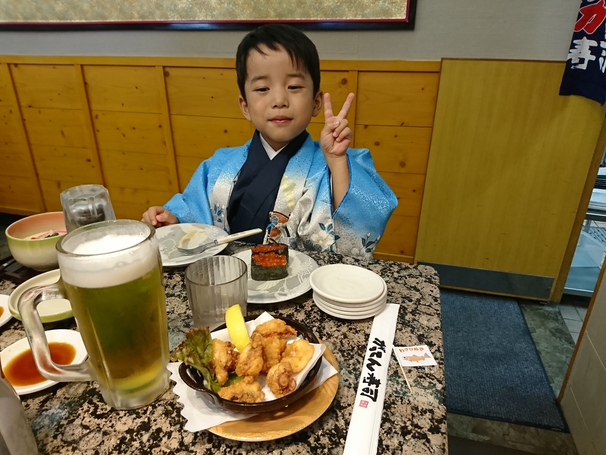 今日は家族イベントで次男の七五三がありまして、昼食は家族で大田原のがってん寿司に行きました。おめでたい事に便乗して、昼間から飲んで寿司をガッツリ頂きます!まぁこんな時しか許してもらわれへんから・・・ まずは暑かったので生中で乾杯だぁ〜
